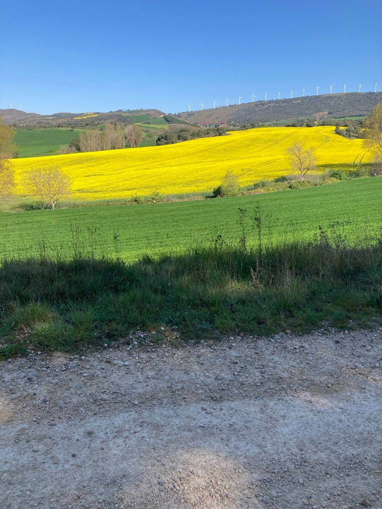 I had a 15 mile hike today on my next stage, and the weather report was for temps to get into the mid-70’s. Knowing that I would have a big hill climb today (up and over the ridge of wind turbines in the photos) I got up early and was on the Camino at 6am. It was a 7 1/2 hour walk, but as you can see in the pictures, I walked through beautiful fields where the crops are in their spring growth spurt. The scenery here is so beautiful. The town I am in is small-ish, and I could only find a private room, for 45 euros. After paying between 10-15 euros a night, it seemed like an extravagance…but then I considered, would I stay in a hotel in the states for around $50?…probably not. It feels like a luxury to have the room to myself. But I’ve been able to spread my stuff out and reorganize backpack. The place is simple but clean. And I really don’t feel that alone….the walls are so thin…if someone scratches themselves next door, I’m pretty sure I could hear them. Looking forward to a solitary nights sleep tonight. Tomorrow’s walk is a couple of kilometers shorter…I won’t say no to that. All for now.
