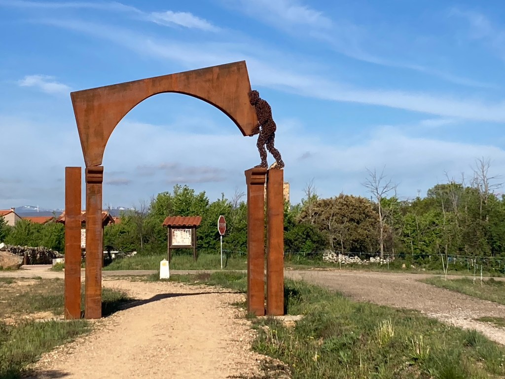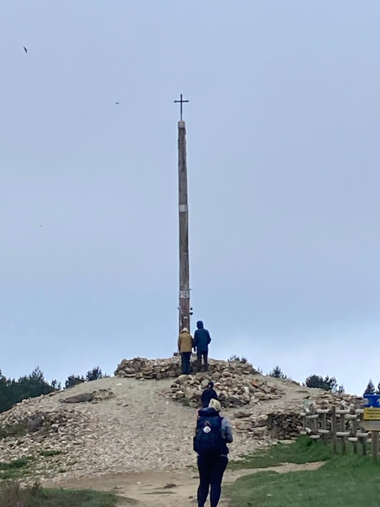 It’s said that an abbott from a nearby monastery, in the 11th century, erected this simple iron cross at the highest point on the Camino, originating in France. One theory is that it was erected so that pilgrims traveling in the winter could recognize the Camino in the deep snow. A custom began to carry a small stone from home, while you were on your pilgrimage, leaving it at the cross with the intent of a prayer, or conviction with that stone. Leaving your stone was also meant as the gesture of ridding yourself of any burden that was keeping you from fully embracing your faith. Over the centuries, the pile of stones (and so I imagine prayers, convictions and burdens) has grown to what we see today. I left two stones….one to remember my family and the other for the memory of Rick Mancuso and his family.