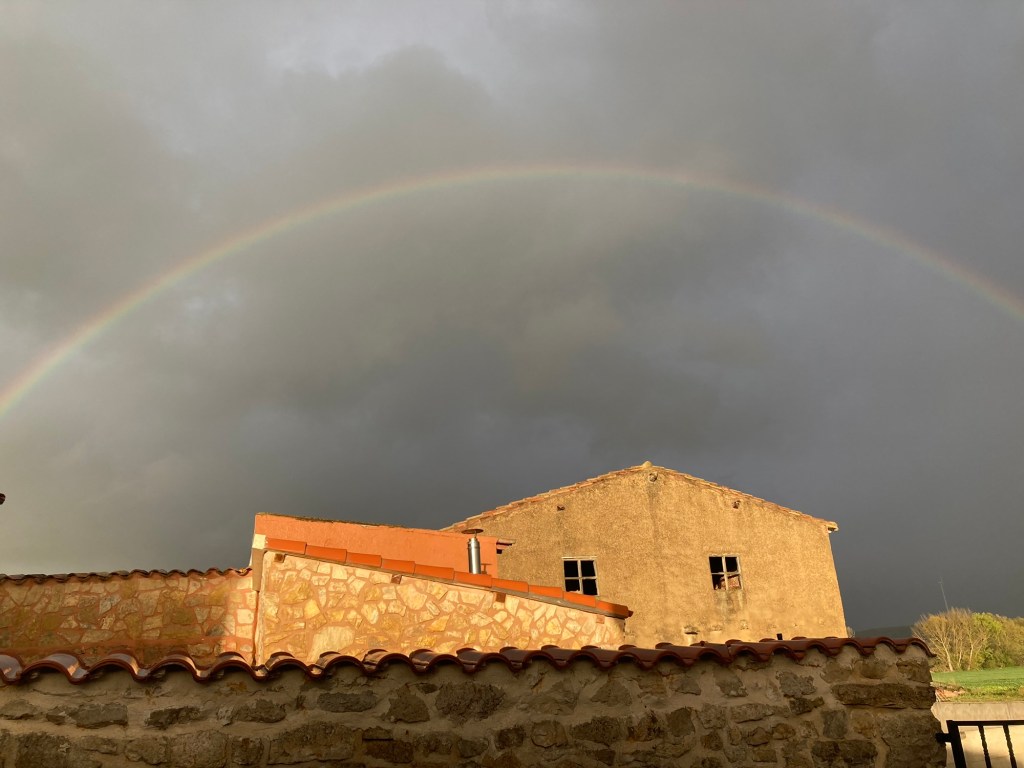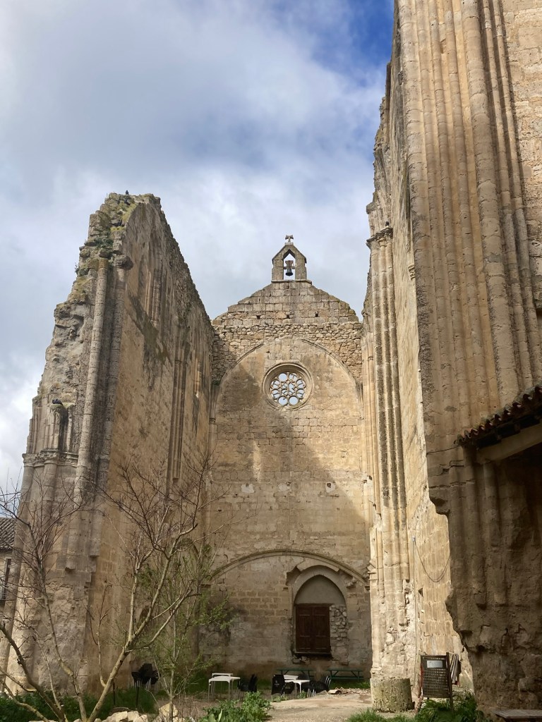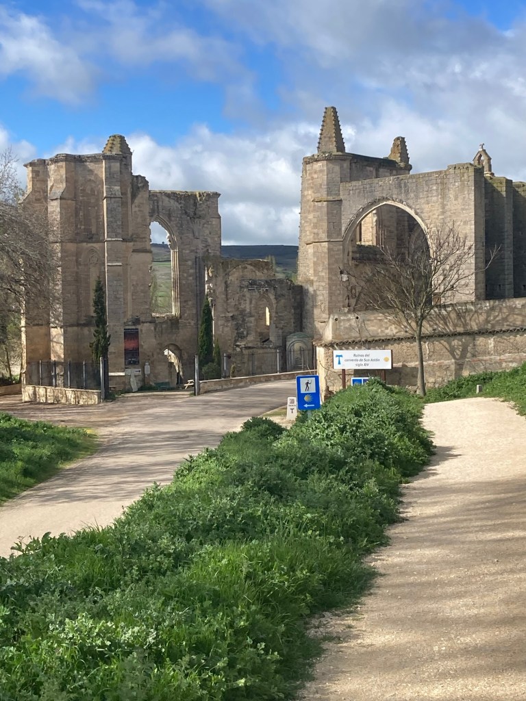 Tomorrow’s Easter and I’ll be walking on to my next stop. Today was a good easy 12 mile day. I’m liking the mesata with its gently rolling hills. The trails are much easier to tackle when you don’t have these steep hills to climb. I’m in another nice alberque. I just finished dinner, getting ready for bed. I sat next to a woman at dinner from the Netherlands who is walking with her husband’s ashes. She plans to spread them in Finisterre, (the end of the land). It’s on the Atlantic a couple of days walk past Santiago. It’s considered to the pilgrims to be as holy a place as Santiago. I came across the ruins of a 14th century monastery, (pictures below) that was the place of a “donativo”. These are places where volunteers set out fruit or snacks, maybe water for the pilgrims to take, asking you to make a donation if you are so inclined. I’ve come across a few of these on my walks, including homeless people looking to help the pilgrims and also help themselves. It was a good day today (except for the brutal non-stop wind and cold). It’s supposed to be warming up a bit. I’ve been able to dodge the rain these past few days. I hope my luck continues.