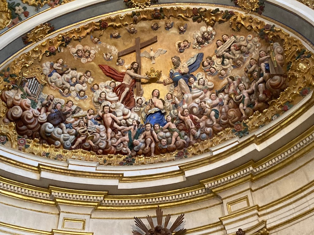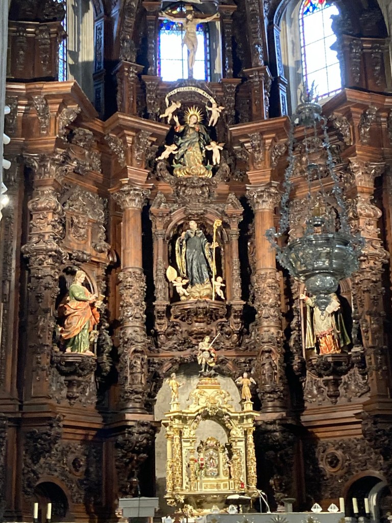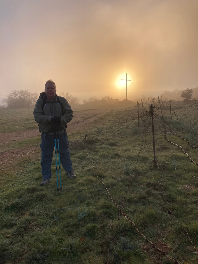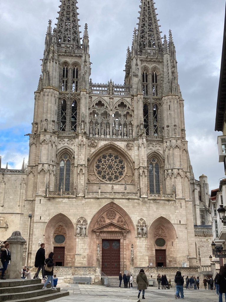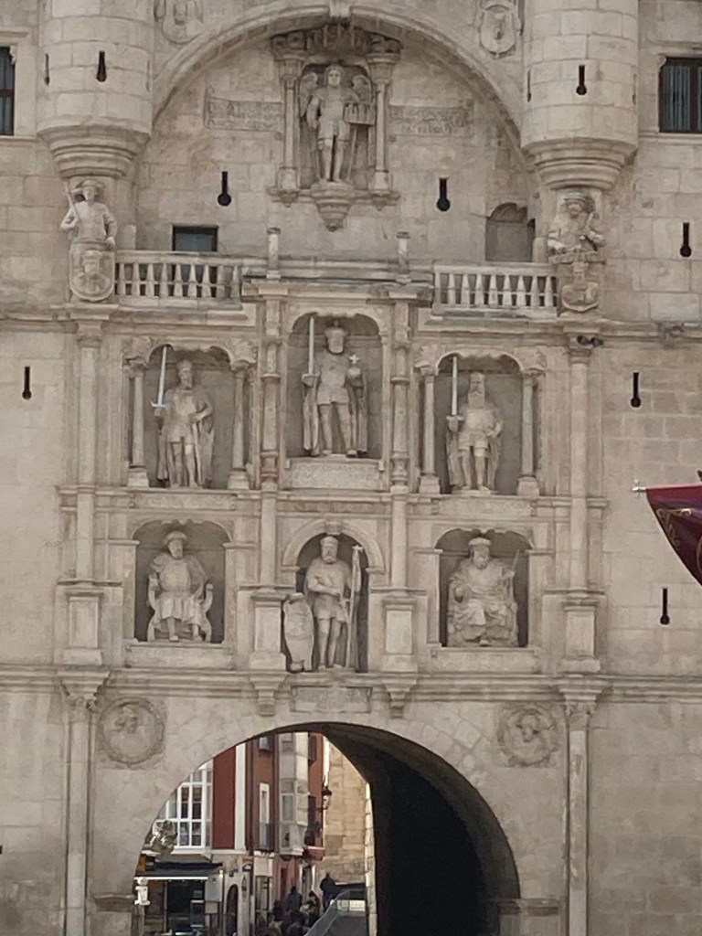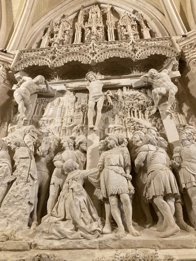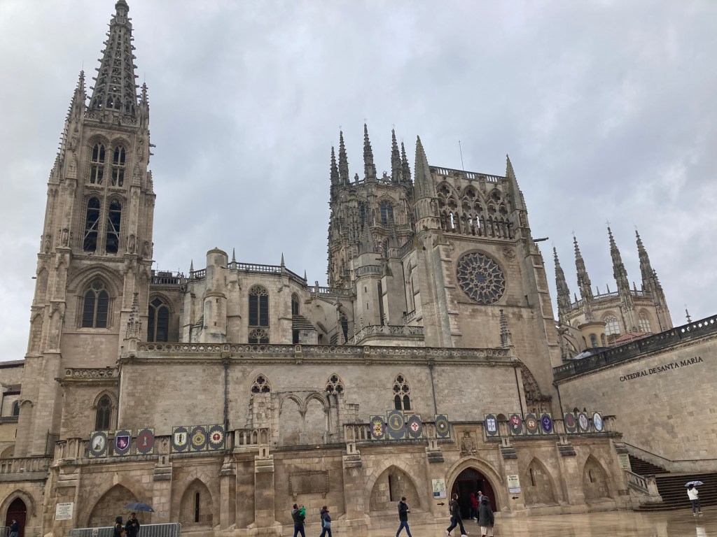 April 16. 13 mile walk this morning. I left the alberque at 6:30. I hiked up a large hill, to find a huge cross and a South Korean pilgrim insisting that he take my picture. The cross and the fog and the sun rising behind me is the picture below. Not sure why he needed to have me pose for the shot (my Korean is really rusty!). I think it looks kind of creepy, but people that I’ve showed it to, seem to like it. Another act of kindness on the Camino. I’m in Burgos now. A bustling and busy city with lots of links to Castile royalty, the church, wealth and the Camino. The #1 attraction here is the Cathedral. I took a self guided tour of the church. The art and architecture of this gothic masterpiece was unbelievable. In fact, it bordered on too much. Every cardinal, bishop, wealthy patron needed to add their “look at me” statement to the place. It was incredibly impressive. I’ve included a couple of the many photos that I took of the interior. What I also found out that by identifying myself as a pilgrim, the normal 12 Euro admission fee was reduced to 5 Euro. Score one for the pilgrims budget!